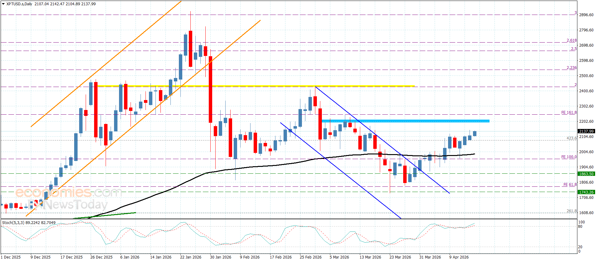 Platinum price renewed the negative corrective attempts, affected by the negative factors that is represented by forming strong barrier at $2245.00 level, besides providing negative momentum by the main indicators, to reach the initial target at $1950.00.