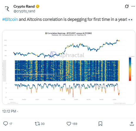 Something interesting is happening in crypto right now that could help Dogecoin’s cause. Many altcoins have been rising even while Bitcoin dropped 3.4% over the past day. That’s unusual – normally when Bitcoin falls, everything else follows.