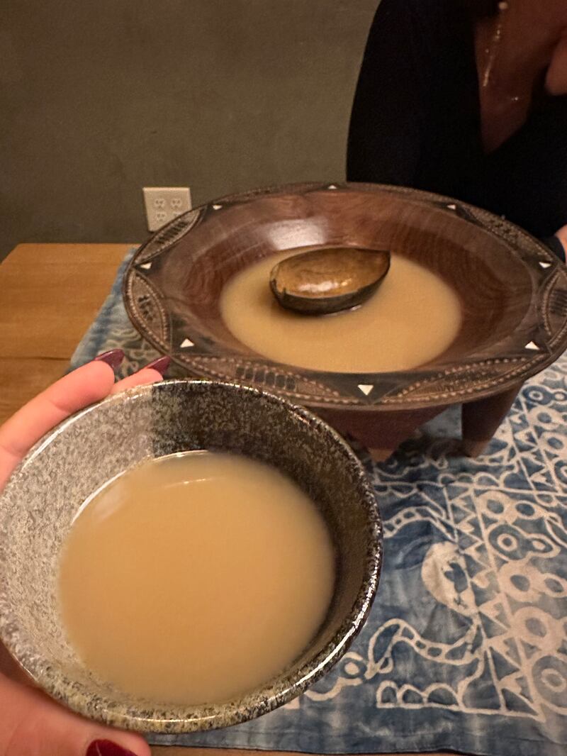 The table’s long bench design was intentional as Enoki hoped that it would encourage strangers to sit next to each other and start conversations. When I took a seat near the end of the bench, I was greeted by Julia Nelligan who was sitting directly across from me. She was invited by Enoki to set up a pop up kava station for the night. Nelligan shared the properties of the drink and asked if I would like to try a cup. Because it was an alternative drink to the tea, guests were expected to pay for the kava if they wanted to indulge. So I put my rose tea to the side and paid seven dollars for a cup of kava served in what looked like a small brown bowl.