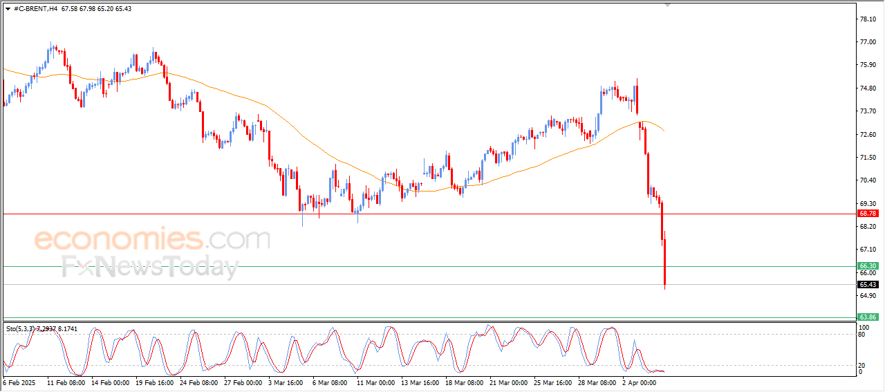 US crude oil price extended its losses in a free fall in the intraday levels, amid the dominance of the main downward trend, with the price breaching the current support of $63.10, as negative signals emerged from the Stochastic despite settling at oversold levels, indicating the strength of the selling momentum.