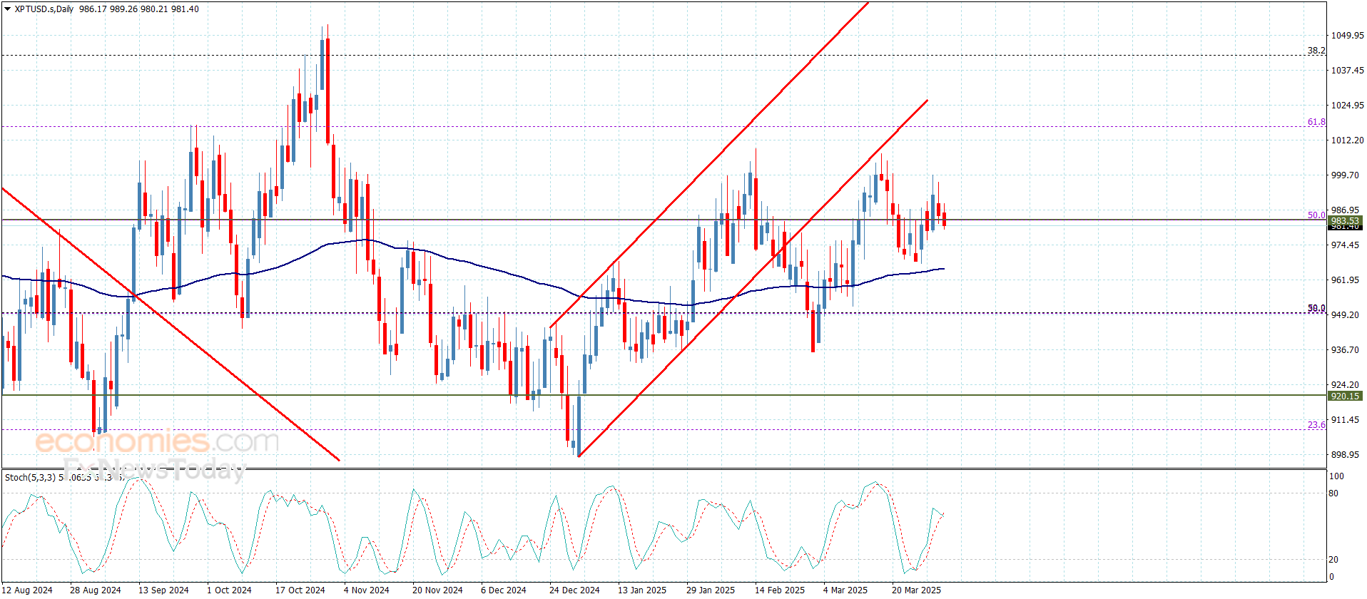 Platinum price closed once more below the stable top of $1007.00, maintaining the chances of activating the downward path, with negative signals from the Stochastic, while the price creeped below the 50% Fibonacci retracement level at $983.