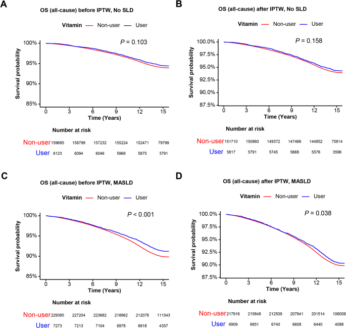 Furthermore, vitamin D, another key component of multivitamin formulations, is known to play a crucial role in regulating immune function and modulating inflammation24,25. Vitamin D deficiency has been linked to worse outcomes in individuals with metabolic diseases, including MASLD, due to its role in reducing pro-inflammatory cytokine production and enhancing insulin sensitivity26,27,28. Vitamin D deficiency has been strongly associated with the progression of CKD, and supplementation may help slow kidney function decline, particularly in individuals with MASLD who are at increased risk of renal complications due to metabolic dysfunction29. Additionally, the antioxidant properties of vitamins C and E may help reduce renal oxidative stress and inflammation, thereby preserving kidney function and reducing the incidence of CKD in high-risk populations30. Therefore, the observed reduction in all-cause mortality in MASLD patients who use multivitamins may reflect the combined impact of these vitamins on reducing the systemic inflammatory and metabolic burden associated with MASLD. Collectively, vitamin D has established immunomodulatory and anti-inflammatory effects, which are particularly relevant in metabolic diseases such as MASLD and CKD.