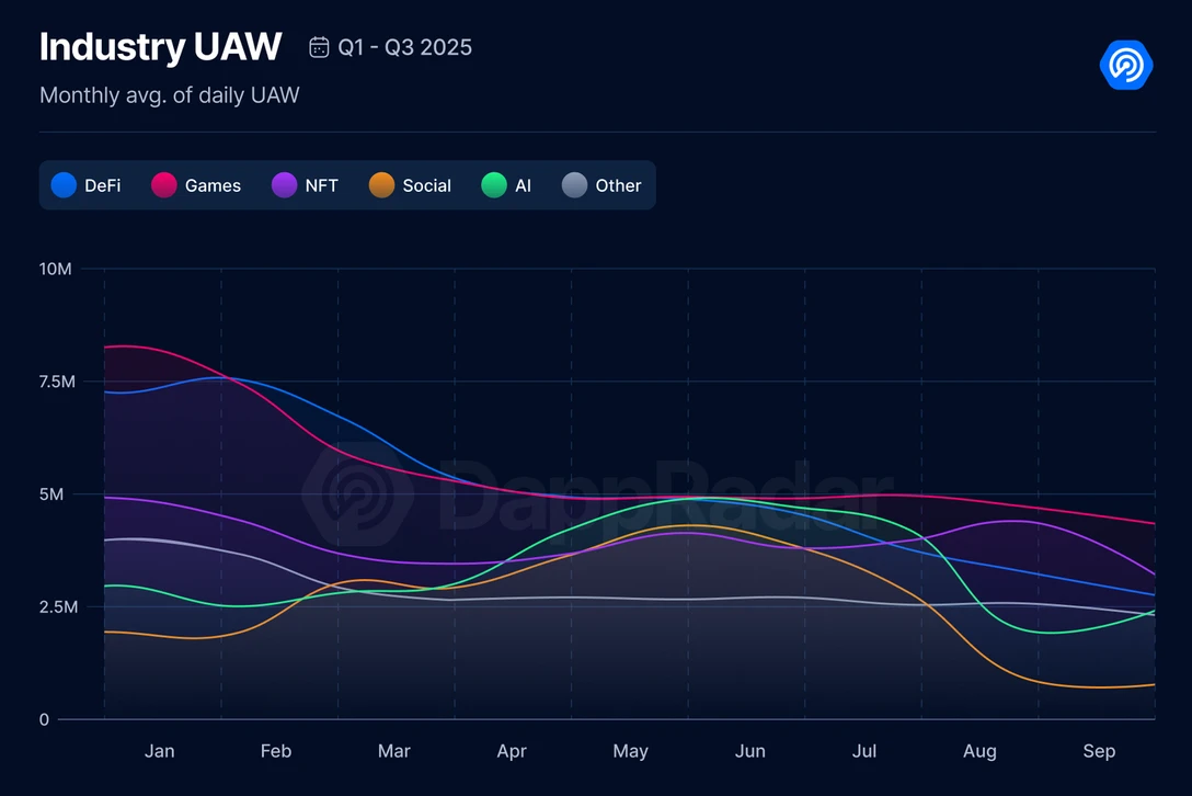 When segmented by market sectors, both the social and AI categories lost market share over the last quarter. In Q2, AI was the third most active market sector, accounting for 18.6%, but this figure dropped to 16.8% in Q3. The social sector was hit harder, declining from 15.9% to 8.4%. In terms of market dominance, the NFT segment has gained market share, now ranking second with 18.5%. Meanwhile, gaming remains the dominant category in the Dapp industry, holding a 25% market share.