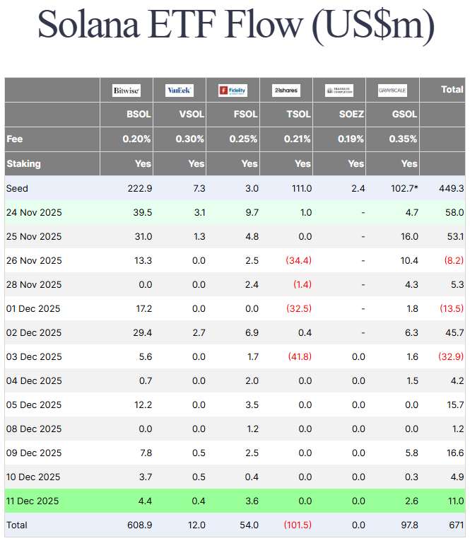According to Farside Investors’ data, the US Spot Solana ETF has recorded an inflow of $11 million on December 11, marking its six-day inflow streak.