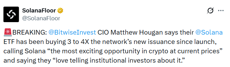 Amid this, Bitwise CIO Matt Hougan has publicly praised Solana, stating that their Solana ETF has been buying 3 to 4 times the network’s new issuance since launch.