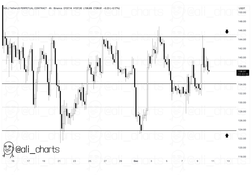 However, analyst Ali Martinez noted that Solana price is consolidating between the $124 and $145 levels, and that is stalling its much-anticipated rally.