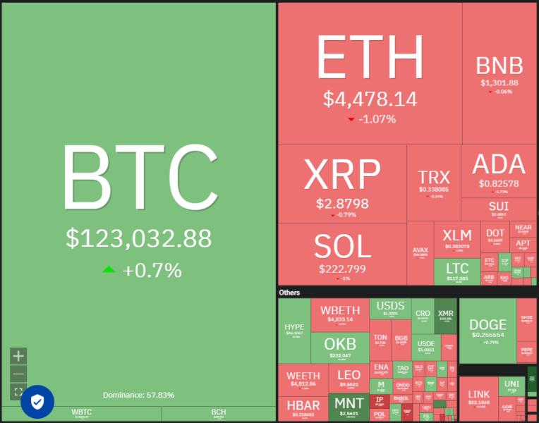 Bitcoin BTCUSD turned down sharply on Tuesday, but the bears could not pull the price below $120,000. That suggests solid demand at lower levels. The bulls have pushed the price above $123,000 and will next attempt to clear the overhead hurdle at $124,474.