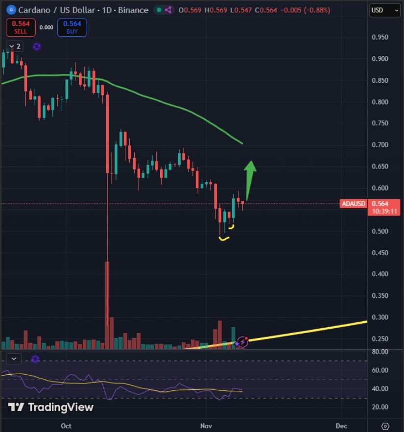 According to Sssebi, Cardano’s short-term chart structure hints at renewed bullish reversal. After a strong Friday push, ADA has been consolidating near the $0.50 to $0.52 zone, forming bottoming tails that indicate dip absorption. The chart shows ADA still trading below its 50-day moving average, leaving room for a continuation rally if buyers sustain momentum.
