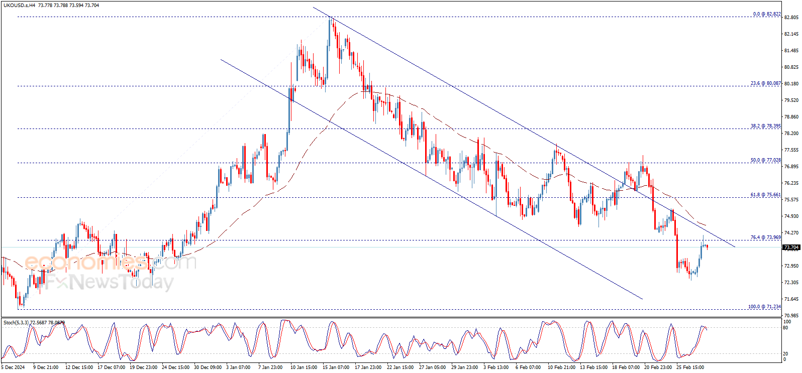 Brent oil price continued to rise to test 74.00$ level, noticing that the price consolidates below this level after attempting to breach it in the previous sessions, accompanied by witnessing clear negative signals through stochastic, which overlaps negatively now.
